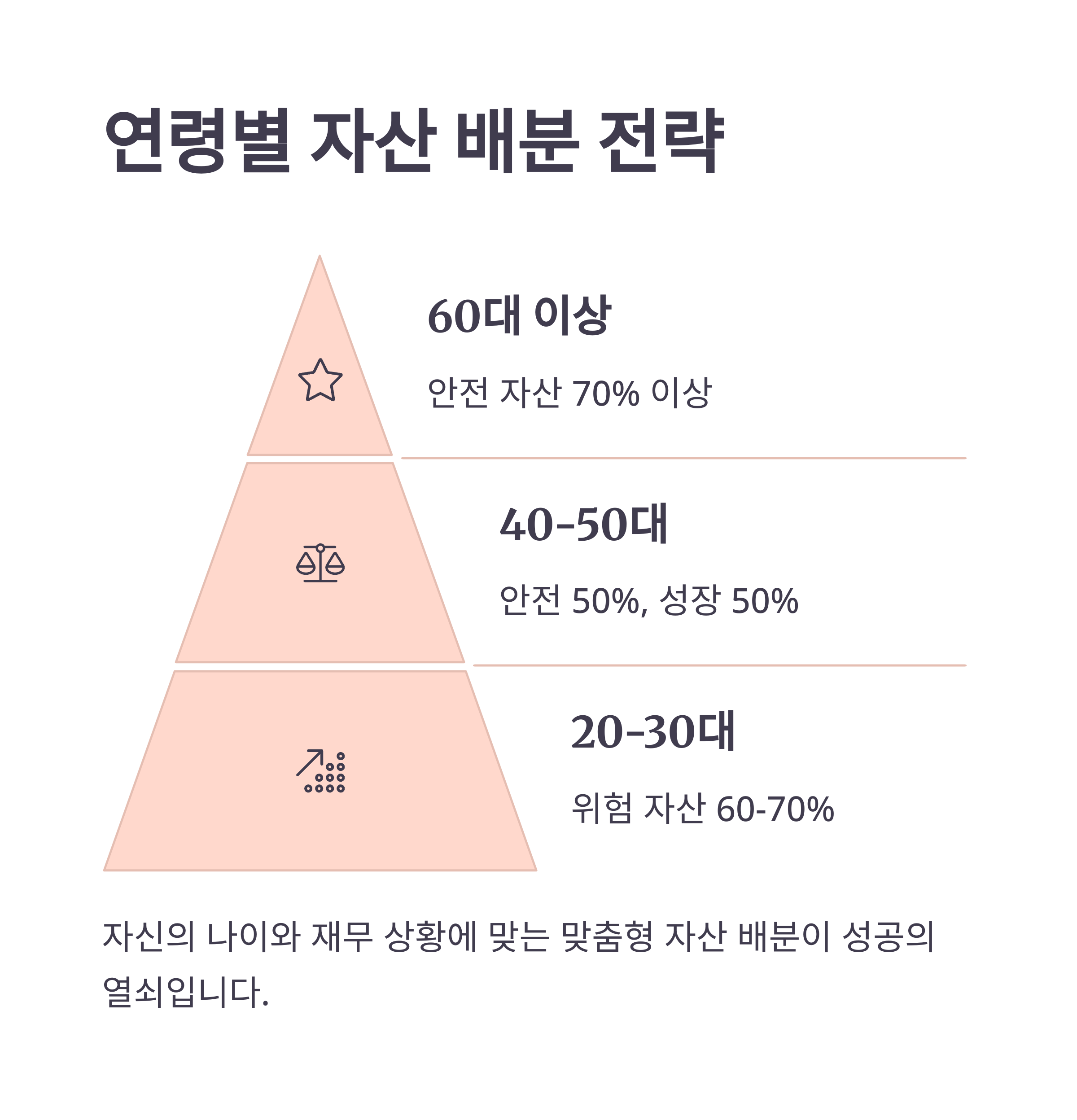 자산 배분은 개인의 재무 상황, 나이, 목표 등에 따라 달라져야 해요. 20대와 60대가 같은 전략을 쓰는 것은 적절하지 않겠죠?