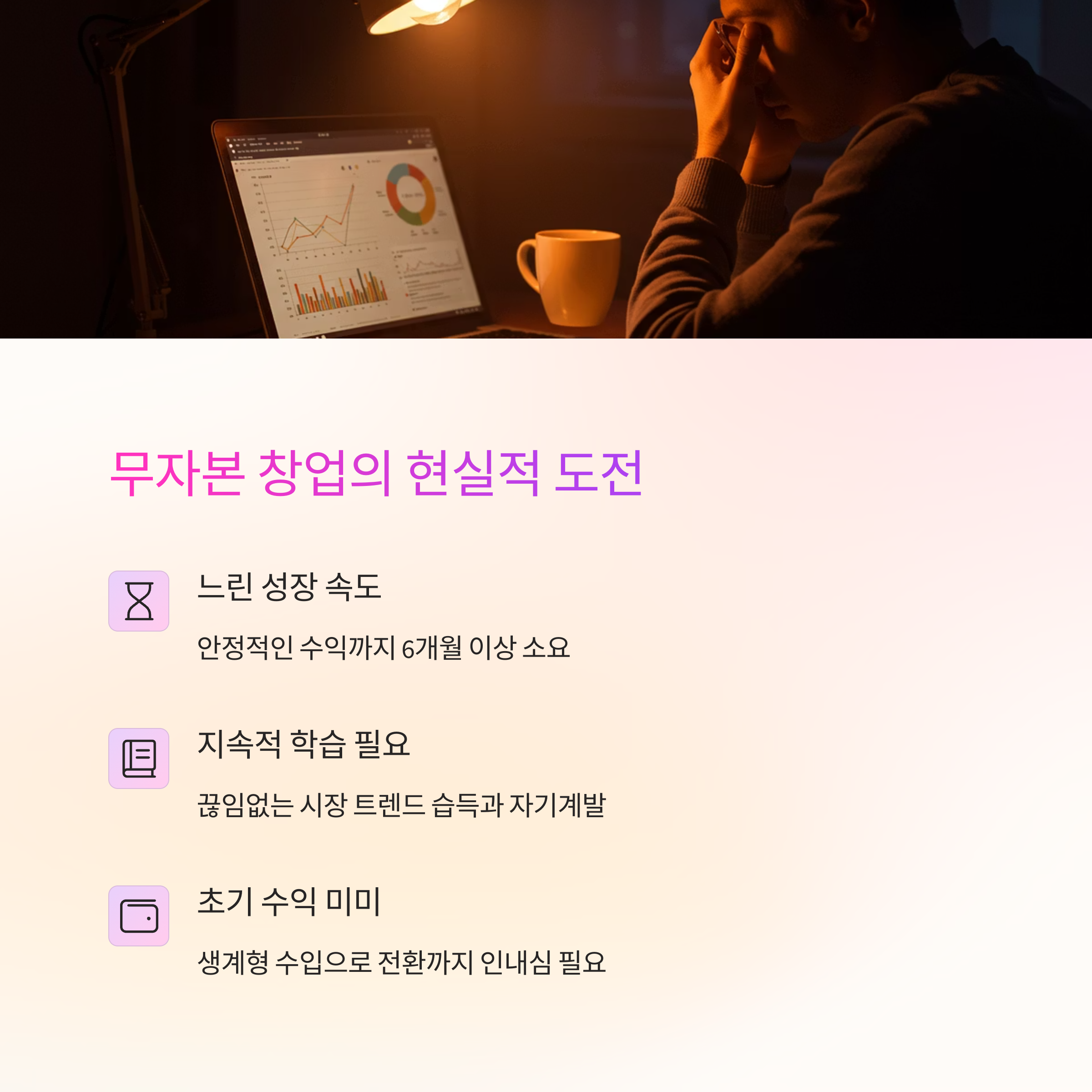 초기 수익은 미미할 수 있어요. 대부분의 무자본 창업은 처음 3~6개월간 거의 수익이 없거나 아주 적을 수 있어요. 이 기간을 버틸 생활비가 필요해요. 💸