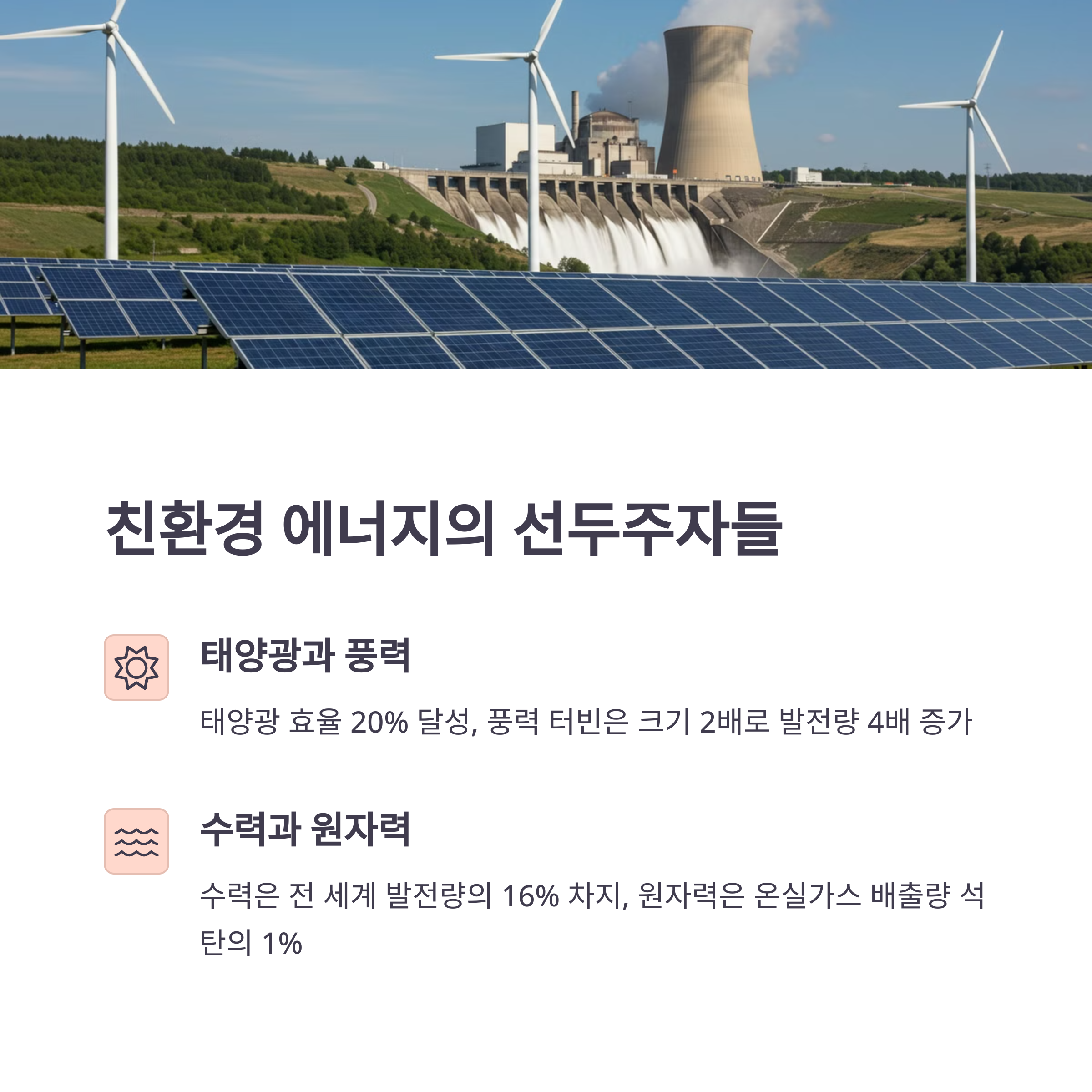 | 수력 | 친환경적이며 발전 효율이 높음 |