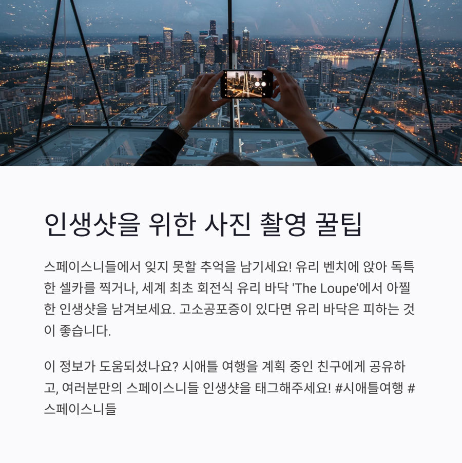 안녕하세요, 오늘은 미국 시애틀의 상징이자 꼭 방문해야 할 명소인 스페이스니들 전망대에 대한 정보를 공유하려고 해요. 🌟