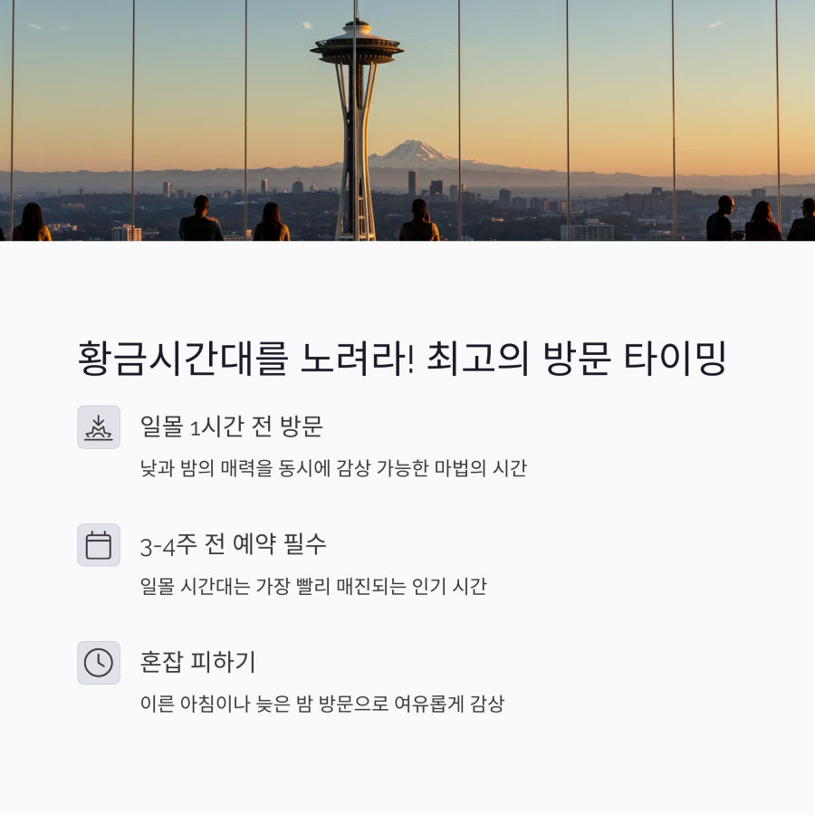 스페이스니들 방문 시 가장 인기 있는 시간대는 일몰 시간이에요. 하늘이 오렌지색으로 물들면서 도시의 불빛이 켜지는 마법 같은 순간을 경험할 수 있거든요. 🌅
