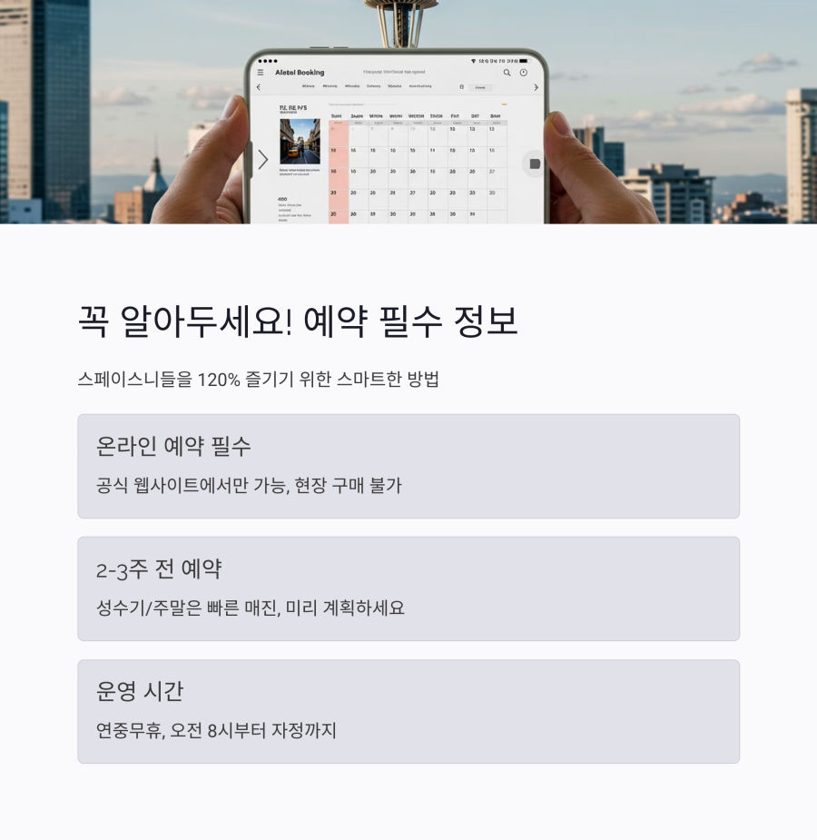 시애틀 여행을 계획하고 계신 분들에게 꼭 알려드리고 싶은 중요한 정보가 있어요. 바로 스페이스니들 예약은 미리 해야 한다는 점이에요!
