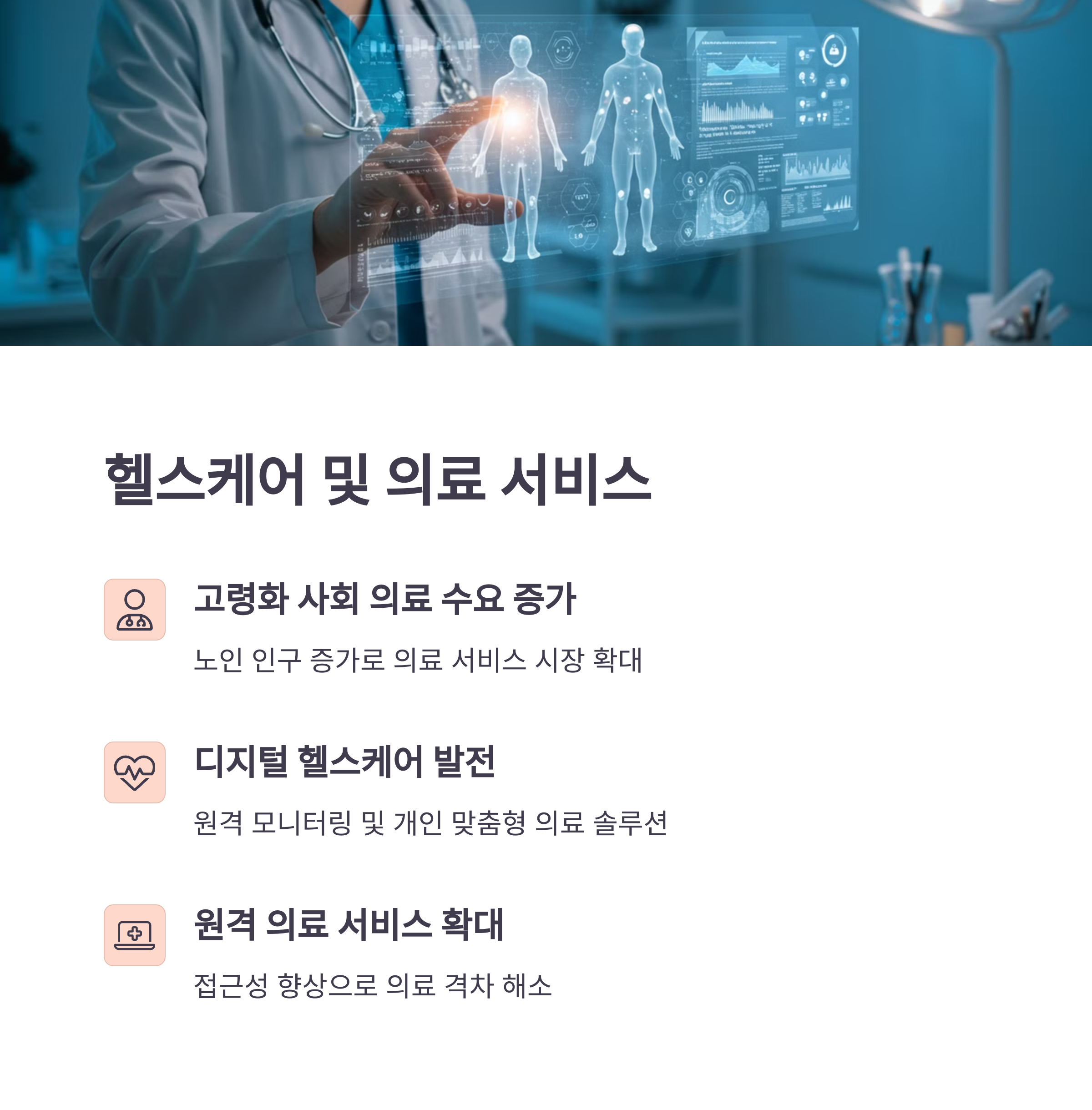 디지털 헬스케어, 원격 의료, 개인 맞춤형 의료 서비스 등 첨단 기술과 의료의 융합은 새로운 성장 동력이 되고 있어요. 🩺