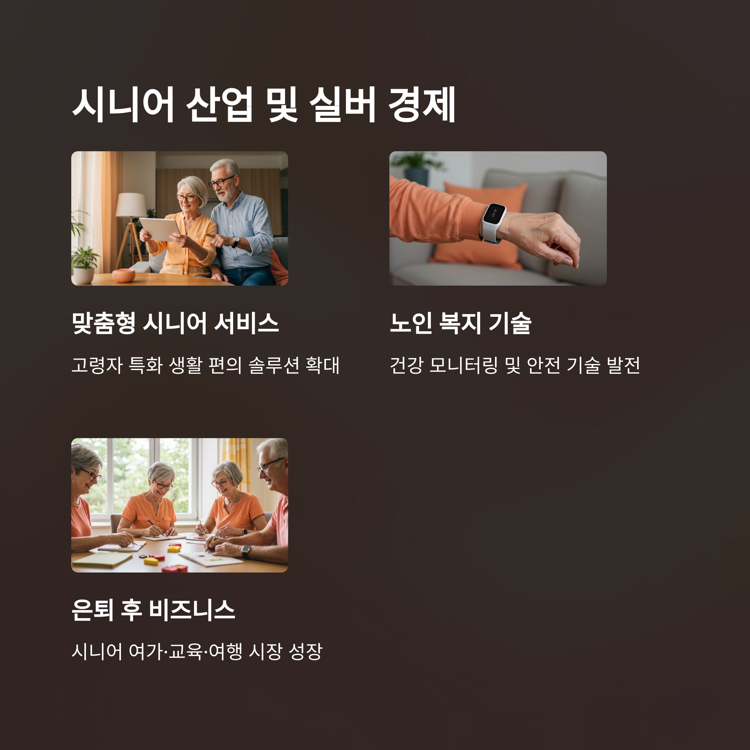 시니어 맞춤형 금융 상품, 노인 돌봄 서비스, 실버 테크 등 다양한 실버 산업이 새로운 시장을 형성하고 있습니다. 👵👴