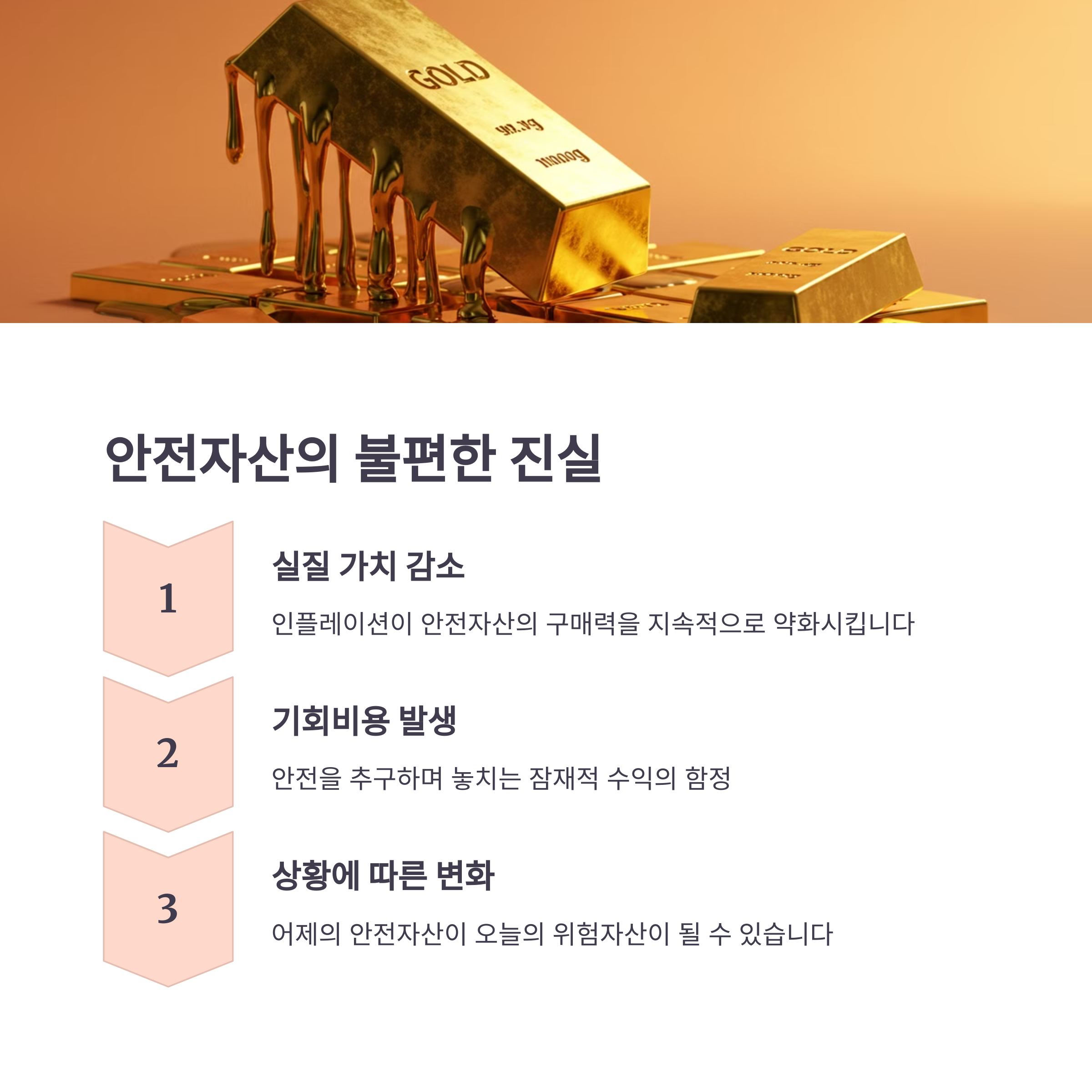 실상은 그렇지 않습니다. 모든 투자에는 나름의 리스크가 존재하며, 안전자산도 인플레이션 리스크나 기회비용이라는 숨겨진 위험을 가지고 있어요.