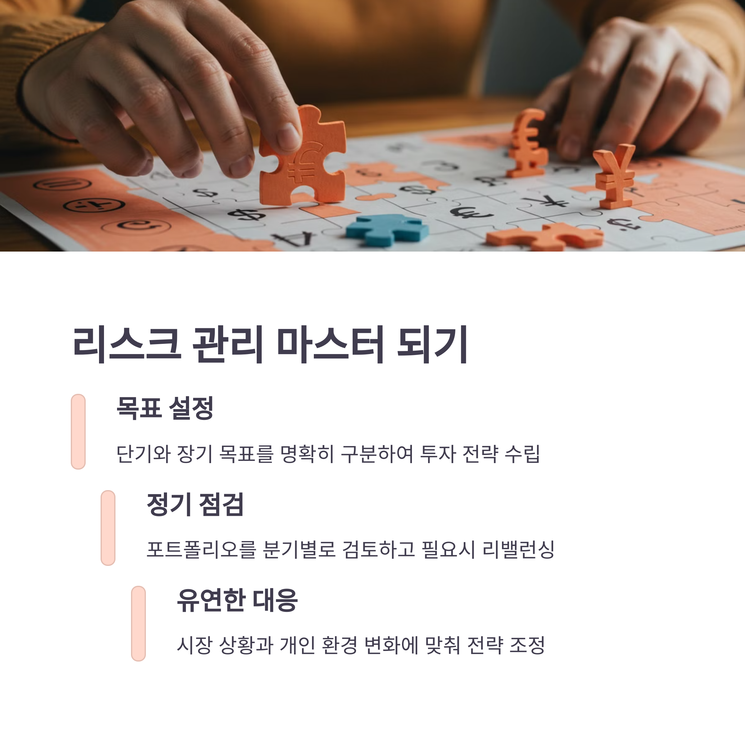 진정한 리스크 관리는 자신의 투자 목표를 명확히 하고, 다양한 자산군에 분산 투자하며, 정기적으로 포트폴리오를 점검하는 데서 시작됩니다.