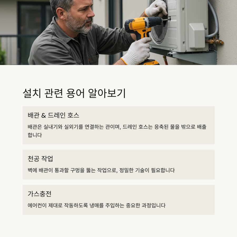 오늘은 에어컨 견적을 문의할 때 자주 사용되는 설치 용어들을 쉽게 정리해드릴게요.