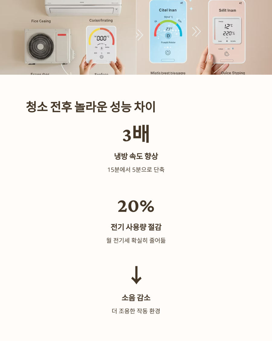 | 냉방 속도 향상, 소음 감소, 전기 사용량 절감 등 확실한 효과를 체감할 수 있습니다. 특히 오래된 실외기일수록 청소 전후 차이가 더 분명하게 느껴집니다. |