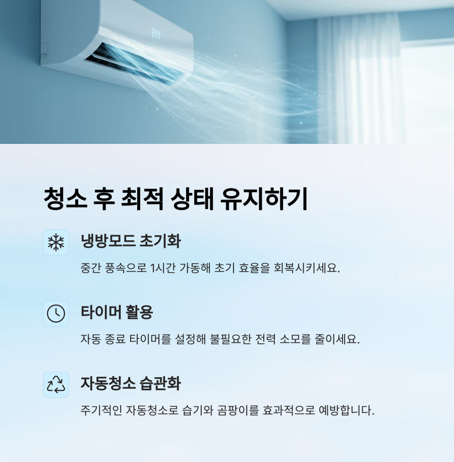 청소 후 첫 가동 시에는 '자동' 모드보다는 '냉방' 모드로 설정하고 중간 풍속으로 1시간 정도 작동시켜 주세요. 이렇게 하면 내부 시스템이 안정화됩니다.