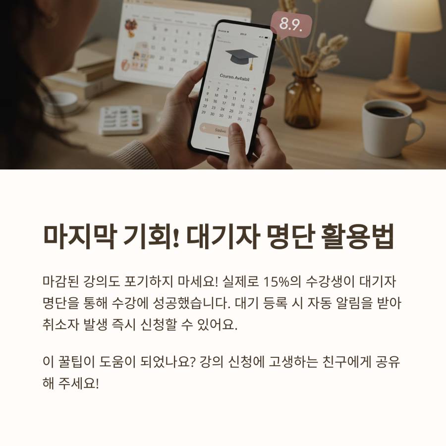 저도 몇 번이나 원하는 강의를 놓쳐서 아쉬웠던 경험이 있어요. 그래서 이 글에서는 제가 직접 시행착오를 겪으며 찾아낸 효과적인 강의 신청 방법을 공유해 드릴게요!