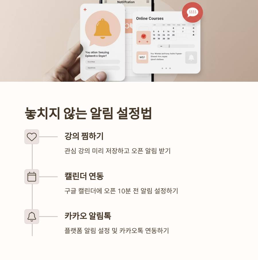 대부분의 플랫폼에서는 관심 강의를 찜해두면 오픈 알림을 받을 수 있어요. 하지만 더 확실하게 하려면 캘린더 앱에 미리 알림을 설정해두는 것도 좋은 방법이에요.