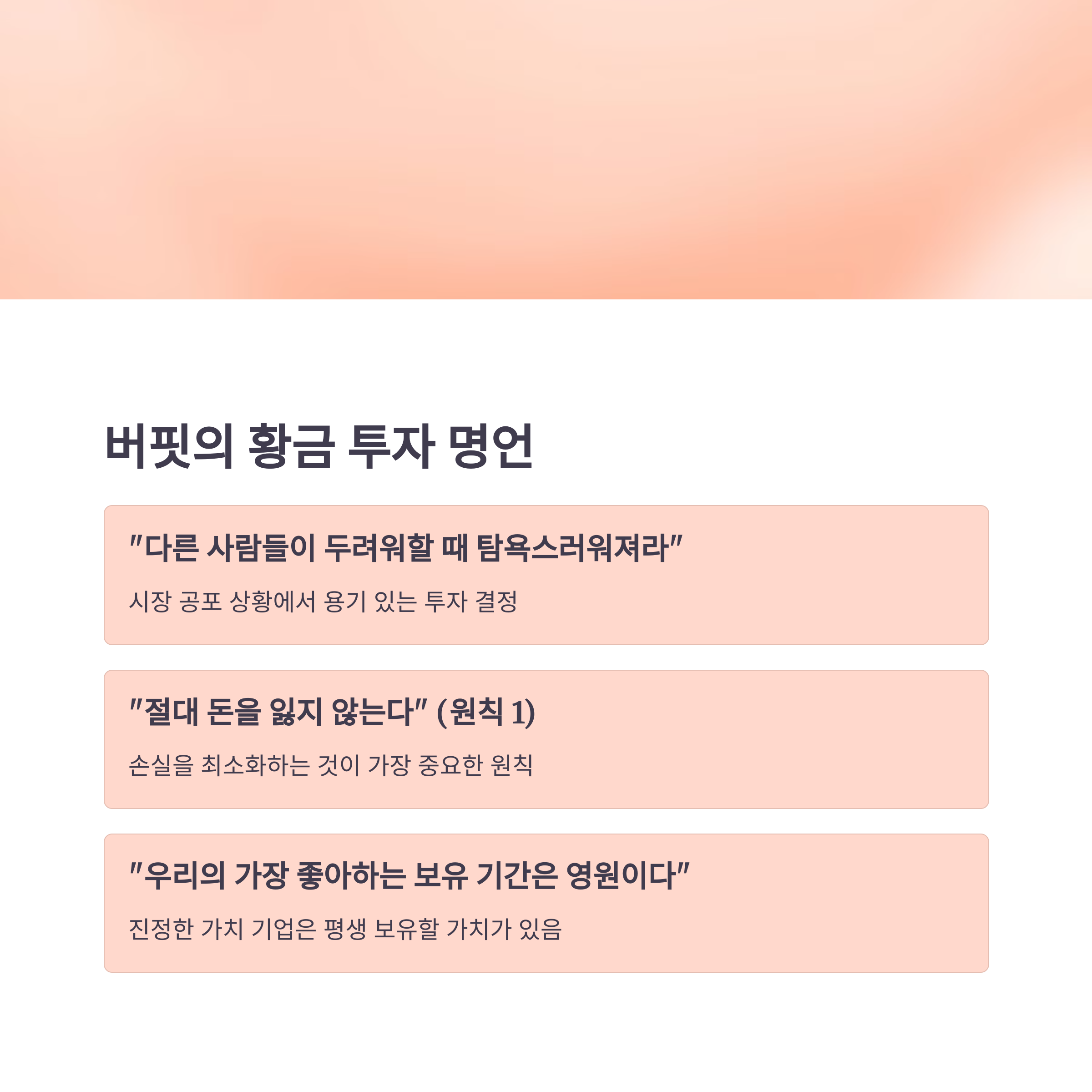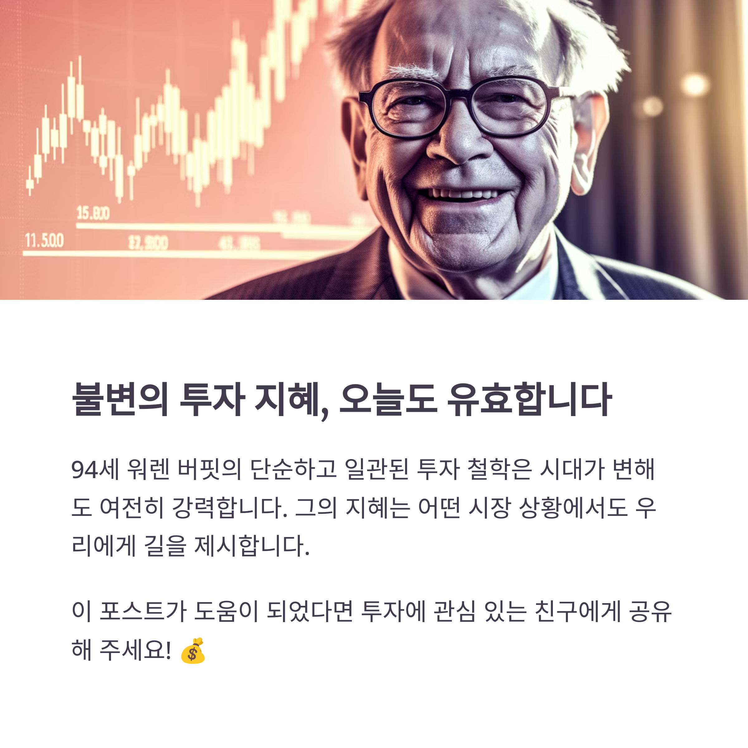 버핏의 투자 철학은 단순하지만 실천하기는 어렵습니다. 감정에 휘둘리지 않고 원칙을 지키며 장기적인 관점을 유지하는 것이 핵심입니다. 여러분도 이러한 원칙을 바탕으로 투자 여정을 시작해 보시는 건 어떨까요?