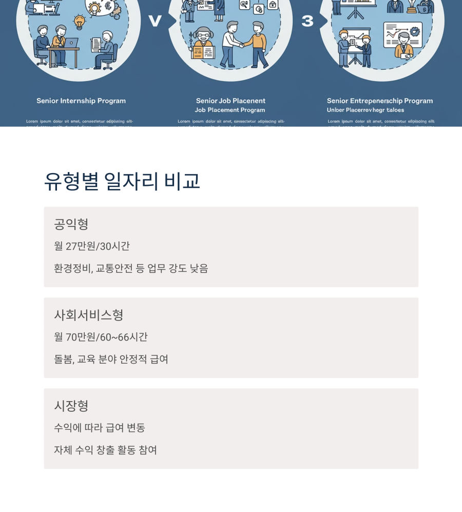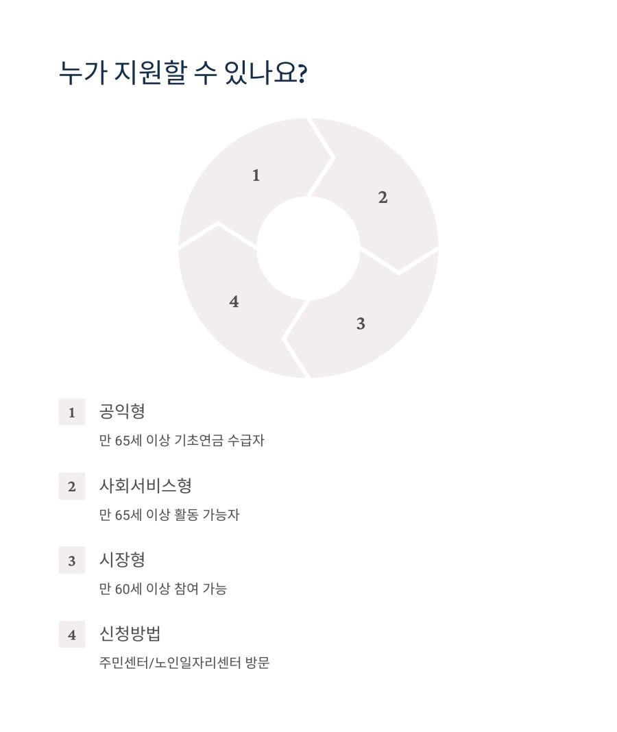 공익형, 사회서비스형, 시장형 등 노인 일자리 사업은 개인의 경력과 선호도에 따라 선택할 수 있답니다. 특히 공익형은 지역사회를 위한 봉사활동 성격이 강하고, 사회서비스형은 돌봄이나 교육 같은 서비스 제공에 초점을 맞추고 있어요.