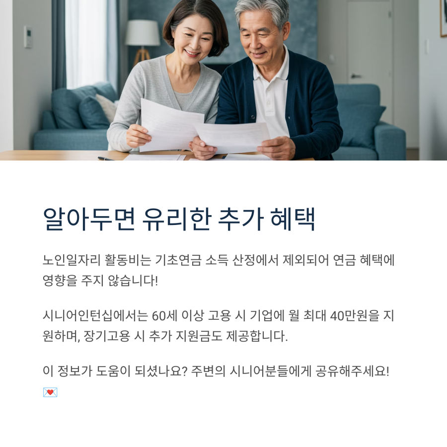 A: 노인일자리 사업 참여로 받는 활동비는 기초연금 산정 시 소득에 포함되지 않아 걱정하지 않으셔도 됩니다. 안심하고 참여하셔도 좋아요.