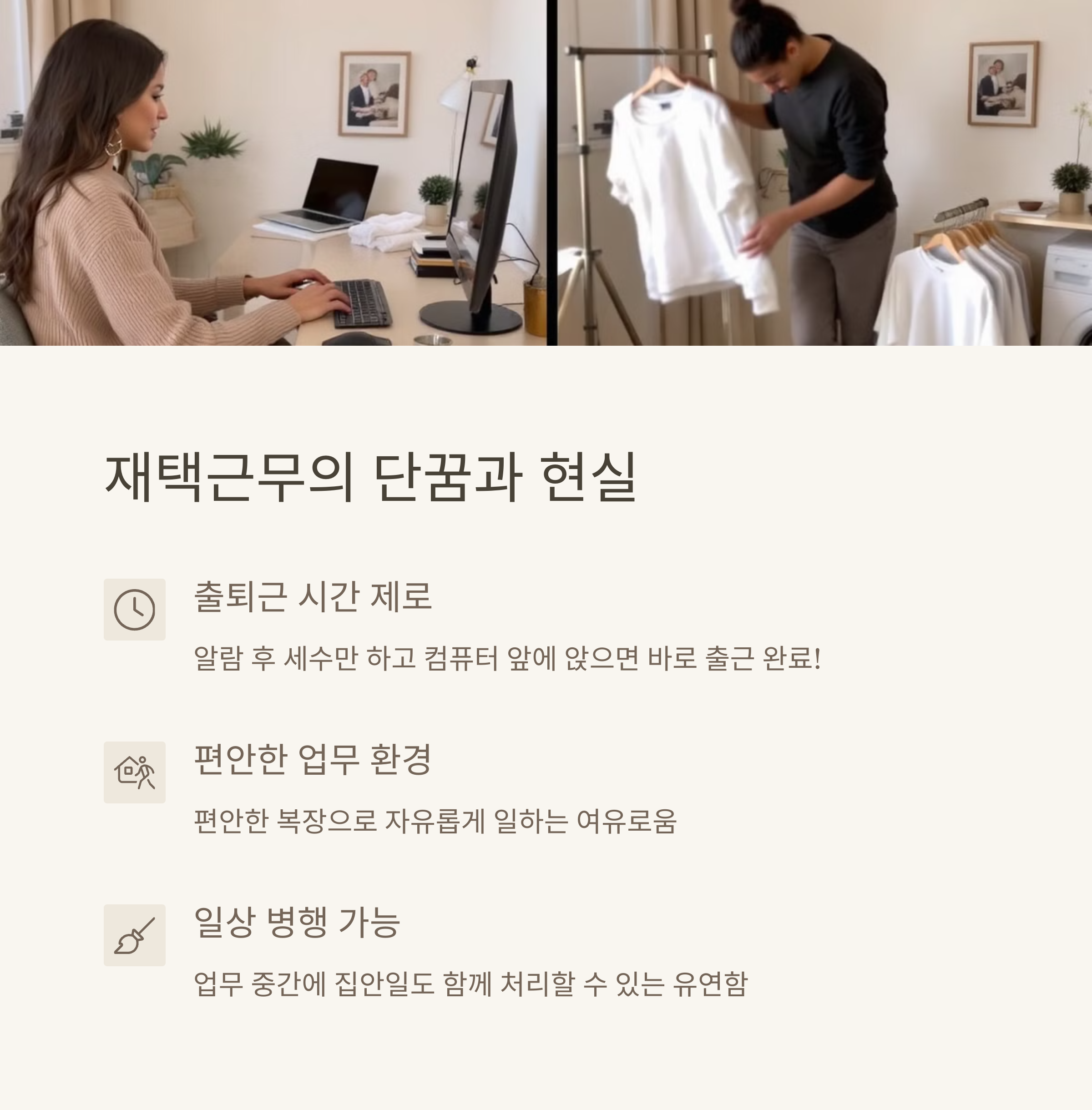 출근 준비 시간도 절약되고, 점심시간에는 직접 요리해 먹을 수도 있고, 중간중간 집안일도 할 수 있어서 일과 삶의 균형이 더 좋아질 거라 생각했어요.