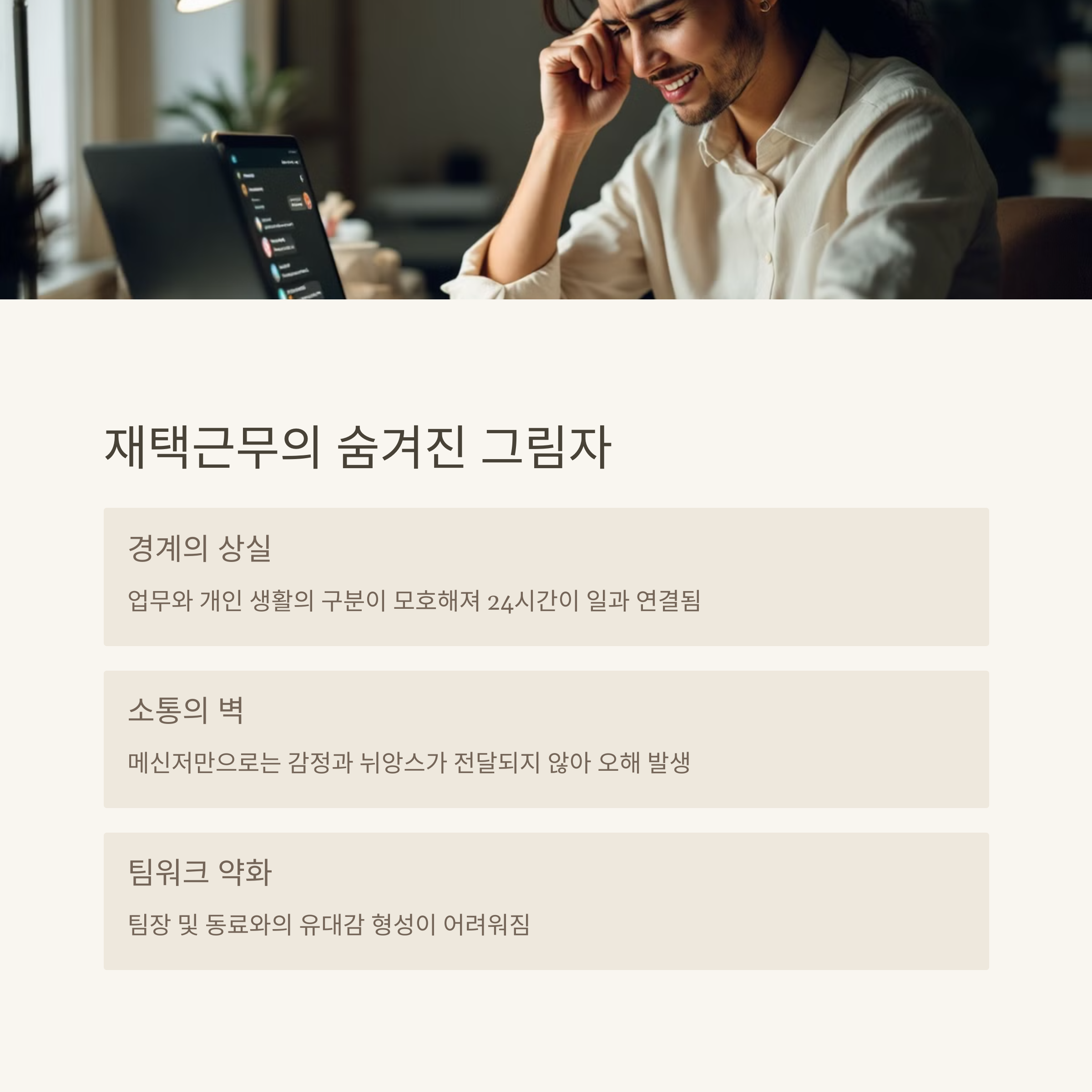 | 팀워크 약화 | 일-삶 경계 붕괴 | 집중력 저하 |