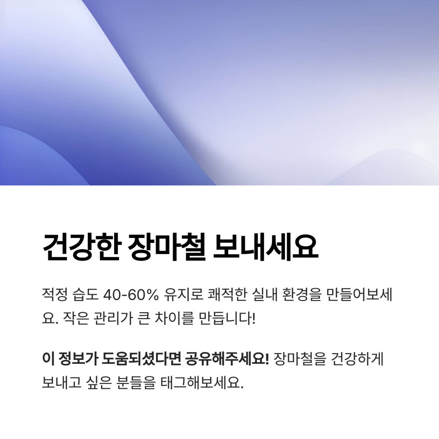 장마철 실내 공기 관리, 어렵지 않죠? 👍 오늘 소개해 드린 방법들을 실천하면 습하고 불쾌한 실내 환경에서 벗어나 쾌적한 집 안 공기를 유지할 수 있을 거예요.