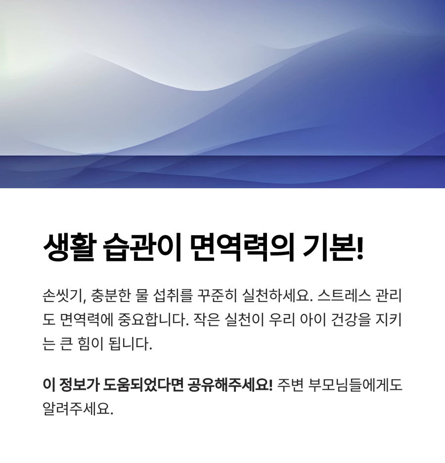 이러한 습관들을 꾸준히 실천한다면 우리 아이들의 면역력을 한층 높일 수 있을 거예요. 💪