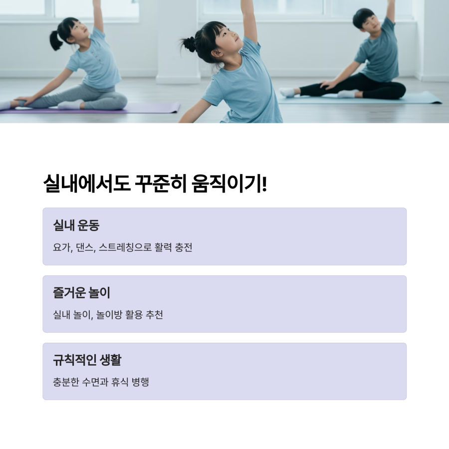 실내에서 할 수 있는 요가, 스트레칭, 댄스 등의 활동을 가족과 함께 해보세요. 💃