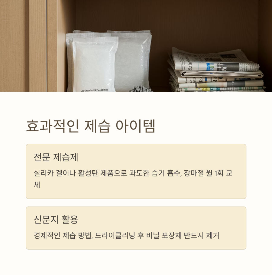 | 제습제는 얼마나 자주 교체해야 하나요? | 일반적으로 2-3개월마다 교체하되, 장마철에는 한 달에 한 번씩 확인해보세요. |