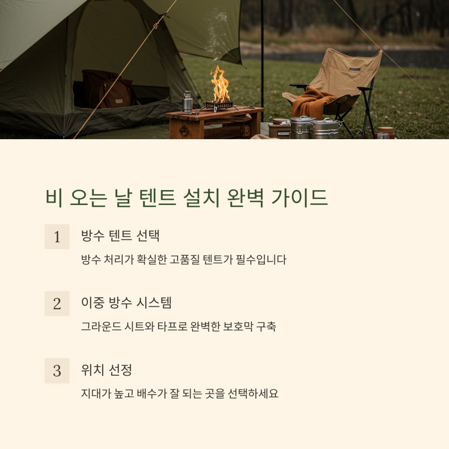 장마철 캠핑의 핵심은 바로 텐트 설치예요. 방수 처리가 된 텐트를 선택하는 것이 가장 중요해요.