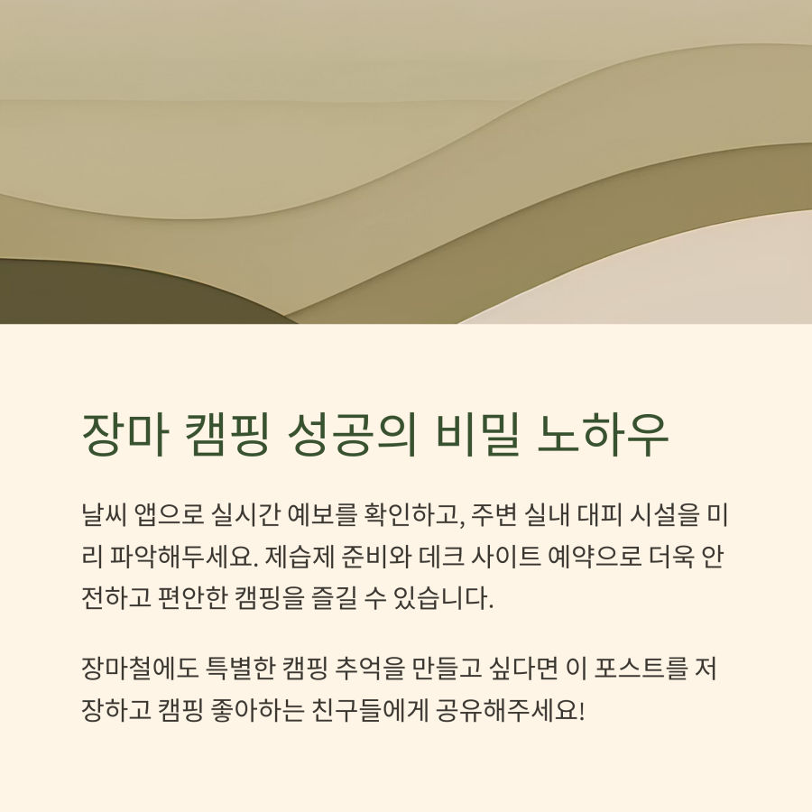장마철 캠핑! 이제 두렵지 않죠? 적절한 준비와 꿀팁만 있다면 비 오는 날의 캠핑도 특별한 추억이 될 거예요. 💕