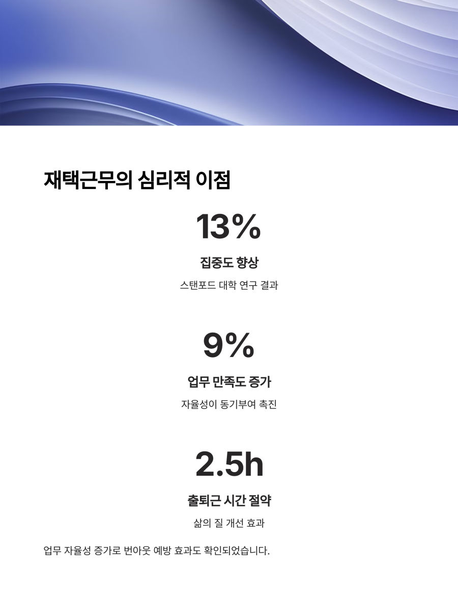 스탠포드 대학의 연구에 따르면, 재택근무자들은 사무실 근무자보다 업무 집중도가 13% 향상되었고, 업무 만족도는 9% 증가했다고 해요.