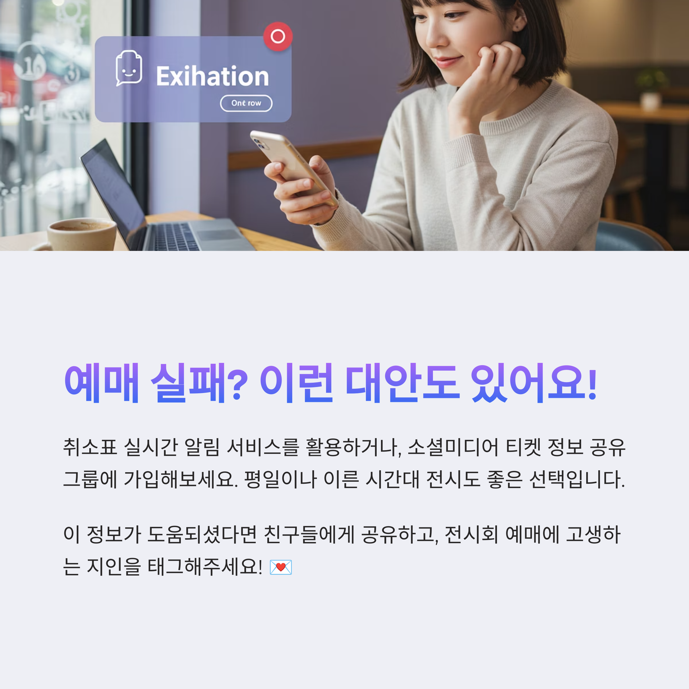 대부분의 인기 전시는 오전 10시나 오후 2시에 티켓 오픈을 하는 경우가 많아요. 정확한 시간을 확인하고 알람을 맞춰두세요.