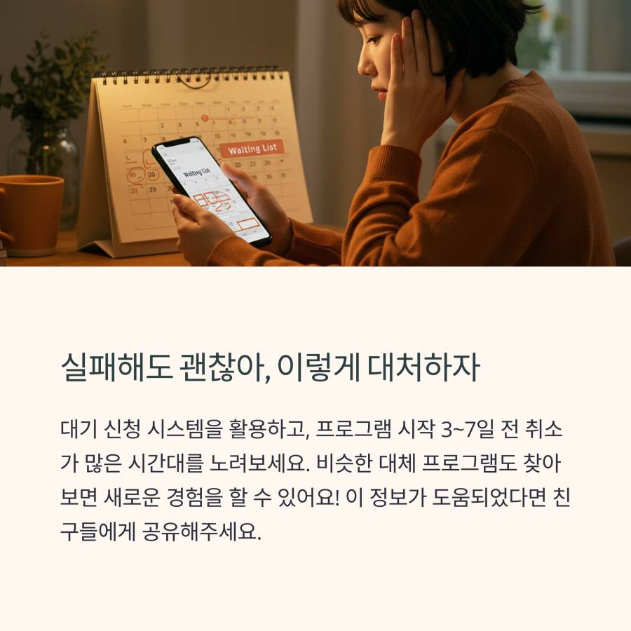 또한 예약 취소가 많이 발생하는 시간대를 노려보세요. 보통 프로그램 시작 3~7일 전에 취소하는 사람들이 많아요. 이 시기에 자주 확인하면 좋아요.