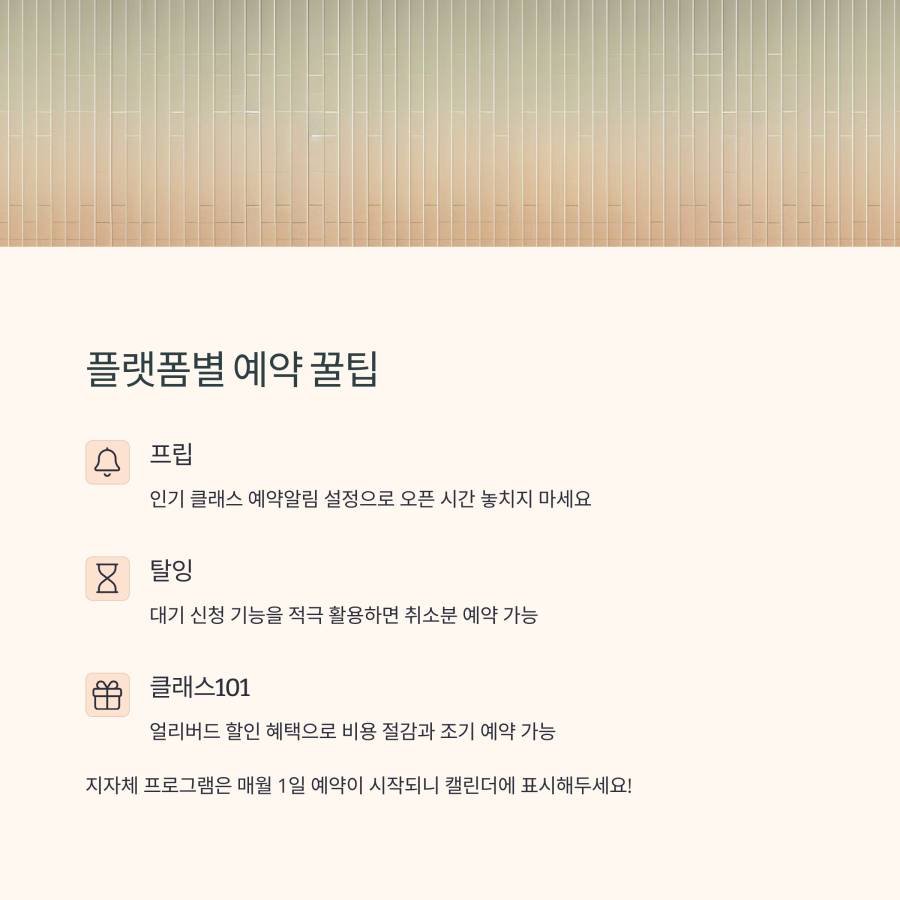 또한 인기 클래스는 주로 평일 오전 10시나 오후 2시에 오픈되는 경우가 많아요. 이 시간대에 미리 알람을 맞춰두고 준비하세요!