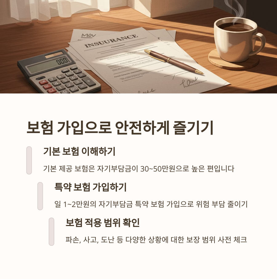 | 기본 보험 | 대인/대물 보상, 자기부담금 30~50만원 | 대여 비용에 포함 |