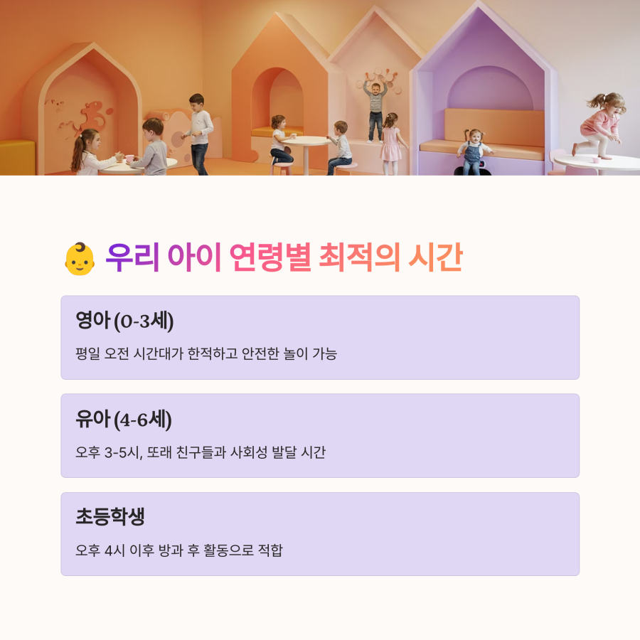 아이의 연령에 따라 키즈카페 방문 시간을 전략적으로 선택하면 더 쾌적하게 이용할 수 있어요.