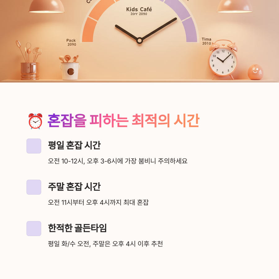 이런 상황을 피하고 아이들에게 최고의 놀이 경험을 선사하기 위한 키즈카페 예약 노하우와 인기 시간대 공략법을 함께 알아보아요!