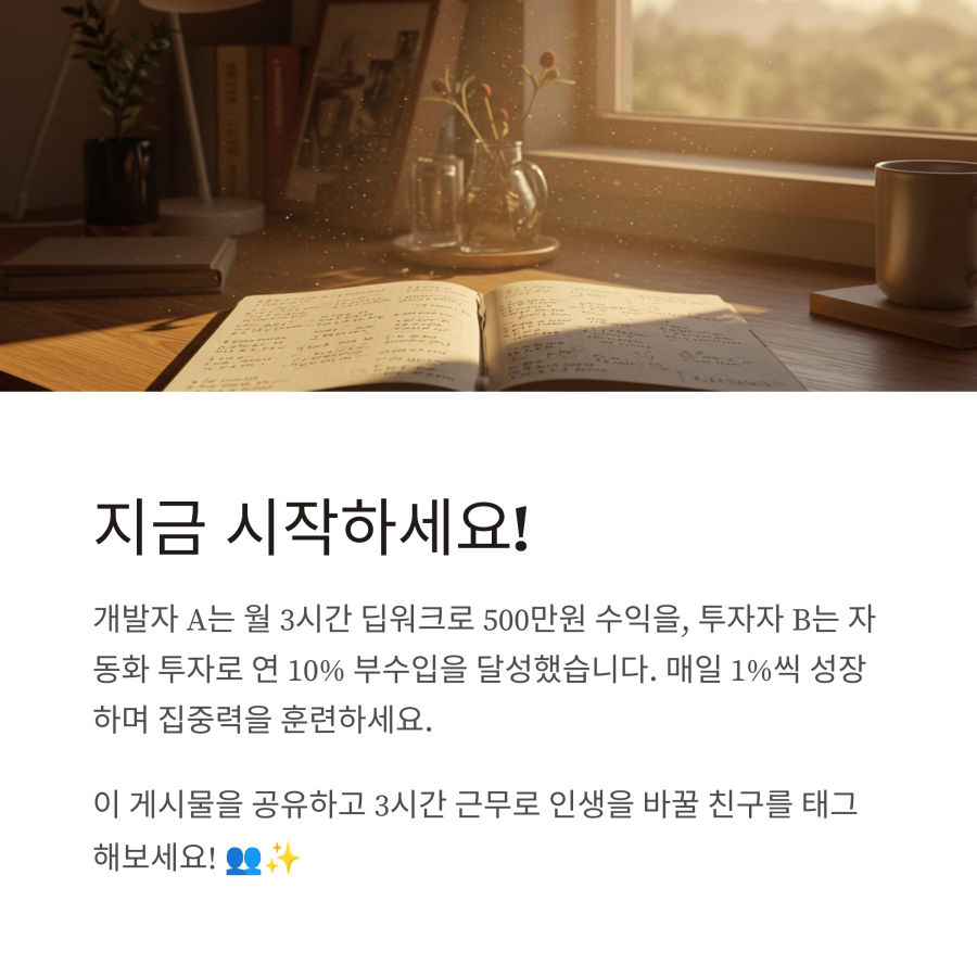 이렇게 되기 위해서는 꾸준한 학습과 실천이 필요해요. 당장 하루 3시간으로 300만원을 버는 것은 어려울 수 있지만, 단계적으로 접근하면 충분히 가능한 목표예요.