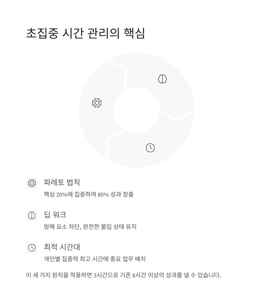 짧은 시간 내에 높은 생산성을 발휘하려면 시간 관리가 무엇보다 중요해요. 가장 효과적인 방법 중 하나는 파레토 법칙(80/20 법칙)을 활용하는 것이에요.