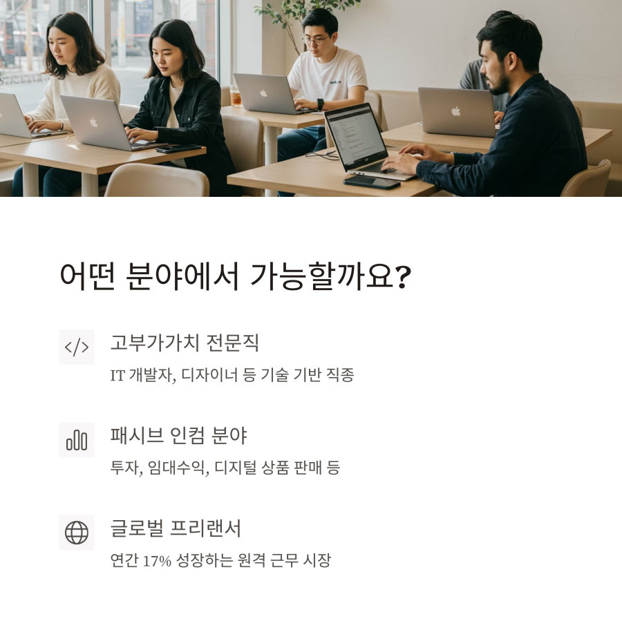 | A. 누구나 당장 가능한 것은 아니에요. 자신만의 전문성을 갖추고, 시장에서 가치를 인정받기까지 시간과 노력이 필요해요. 하지만 올바른 전략과 꾸준한 실행력을 갖춘다면 충분히 달성 가능한 목표예요. |