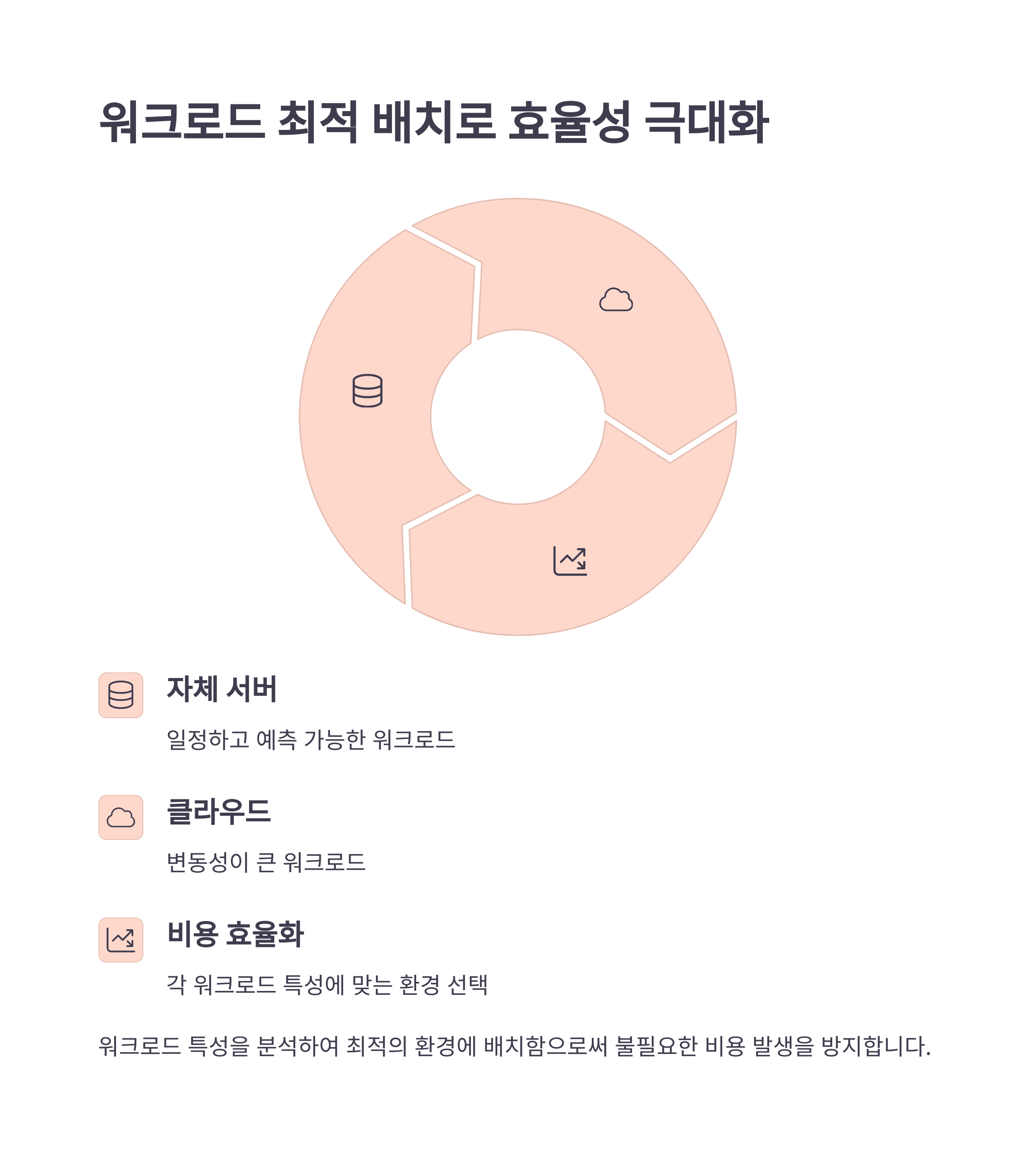 예를 들어, 데이터베이스와 같이 일정하고 예측 가능한 워크로드는 자체 서버에서 운영하는 것이 장기적으로 비용 효율적일 수 있어요. 반면, 웹사이트 트래픽처럼 변동성이 큰 워크로드는 클라우드의 탄력적 확장성을 활용하는 것이 유리하죠.