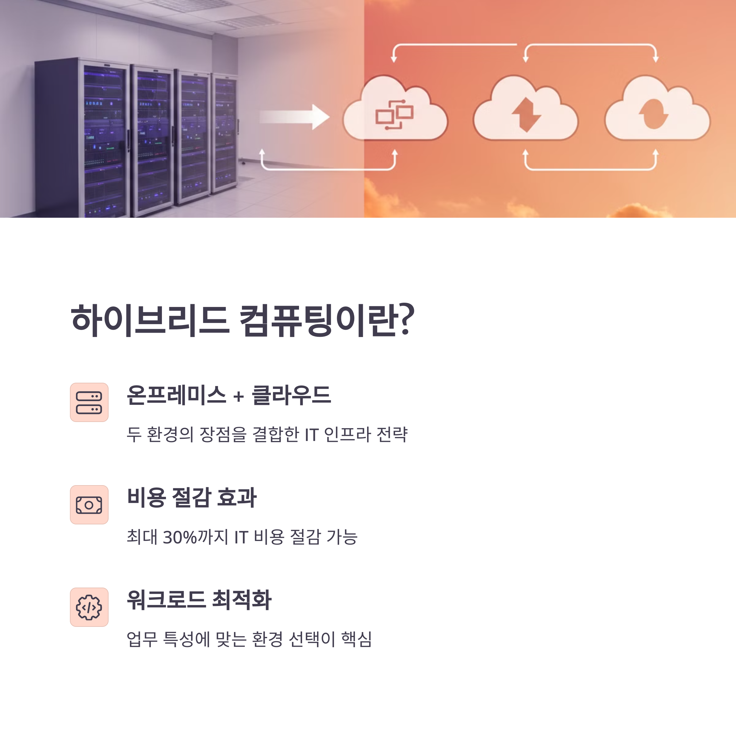 하이브리드 컴퓨팅이란 온프레미스(자체 서버)와 클라우드 환경을 함께 활용하는 방식을 말합니다. 이런 접근 방식은 각 환경의 장점을 최대한 활용할 수 있게 해주죠.