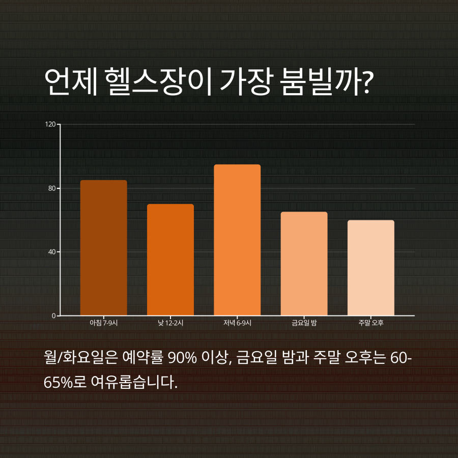 특히 월요일과 화요일은 한 주를 시작하는 날이라 헬스장이 더 붐비는 경향이 있어요. 반면에 금요일 밤이나 주말 오후는 상대적으로 여유롭답니다.