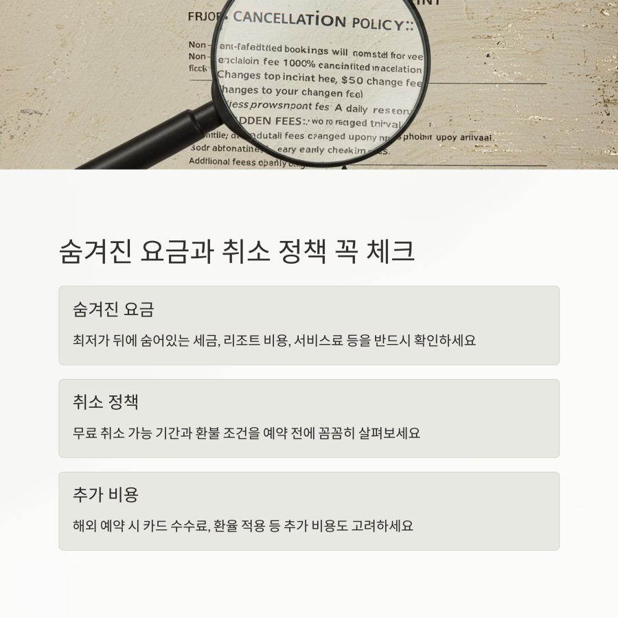 예약 전에는 꼭 취소 정책과 숨겨진 요금(리조트 피, 청소비 등)이 있는지 확인하는 것이 중요해요. 저렴해 보였던 가격이 나중에 추가 요금으로 예상보다 비싸질 수 있거든요.