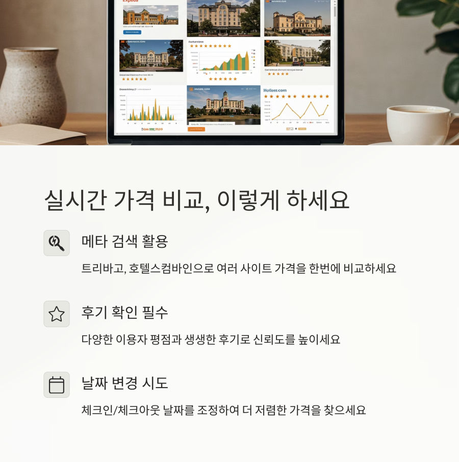 실시간 가격 비교 사이트를 이용하면 여러 예약 플랫폼의 가격을 한 번에 비교할 수 있어 시간도 절약되고 최저가로 예약할 수 있는 기회를 놓치지 않게 돼요. 😊