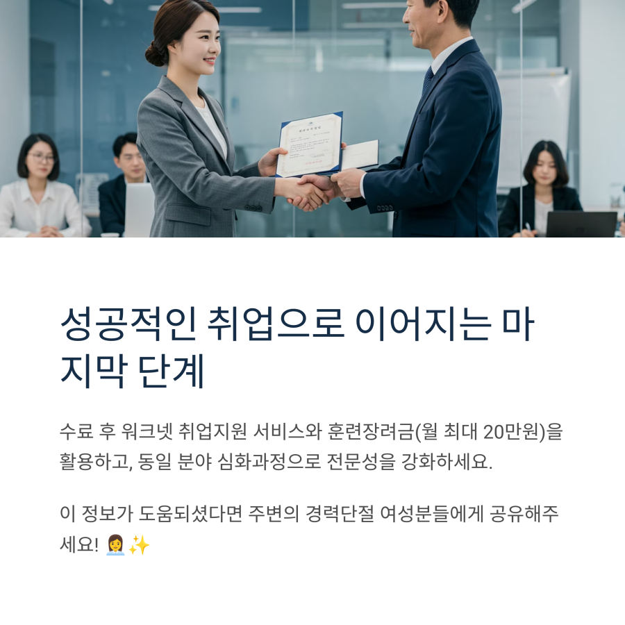 경력단절 기간이 길어질수록 취업 장벽이 높아지는 것이 현실이지만, HRD-Net의 체계적인 교육과정을 통해 새로운 역량을 쌓는다면 재취업의 기회를 크게 높일 수 있어요. 😊
