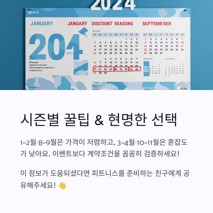 가격만 고려한다면 1~2월 신년 할인 또는 8~9월 가을 시즌이 유리해요. 이 시기는 상대적으로 회원 모집이 어려워 할인율이 높고, 추가 혜택도 많은 편입니다. 🏷️