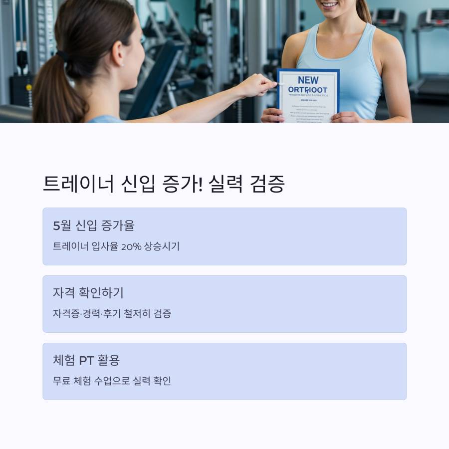 PT(Personal Training)는 저렴한 비용이 아니기 때문에, 강사의 실력은 정말 중요한 부분이에요. 특히 5월에는 수요가 많아 신입 트레이너가 갑자기 늘어나는 시기이기도 합니다.