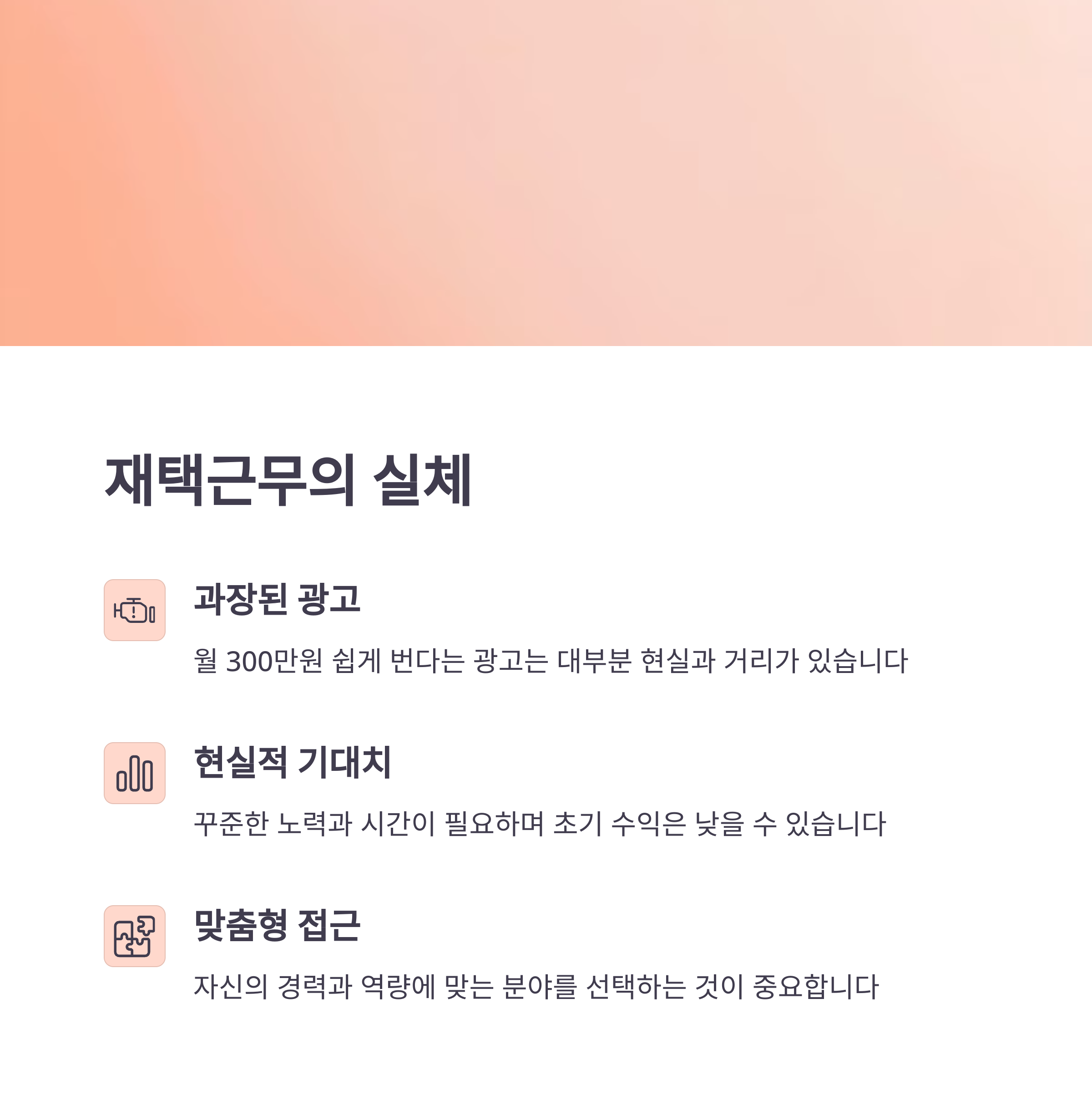 실제로 많은 재택근무 기회는 꾸준한 노력과 학습이 필요하고, 초기에는 낮은 수익으로 시작하는 경우가 일반적이에요.
