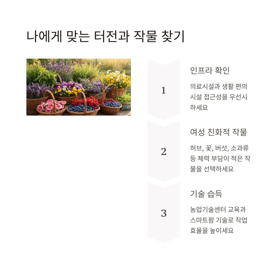 | 작물 선택 | 여성 친화적 작물, 체력 부담 고려, 시장성 |