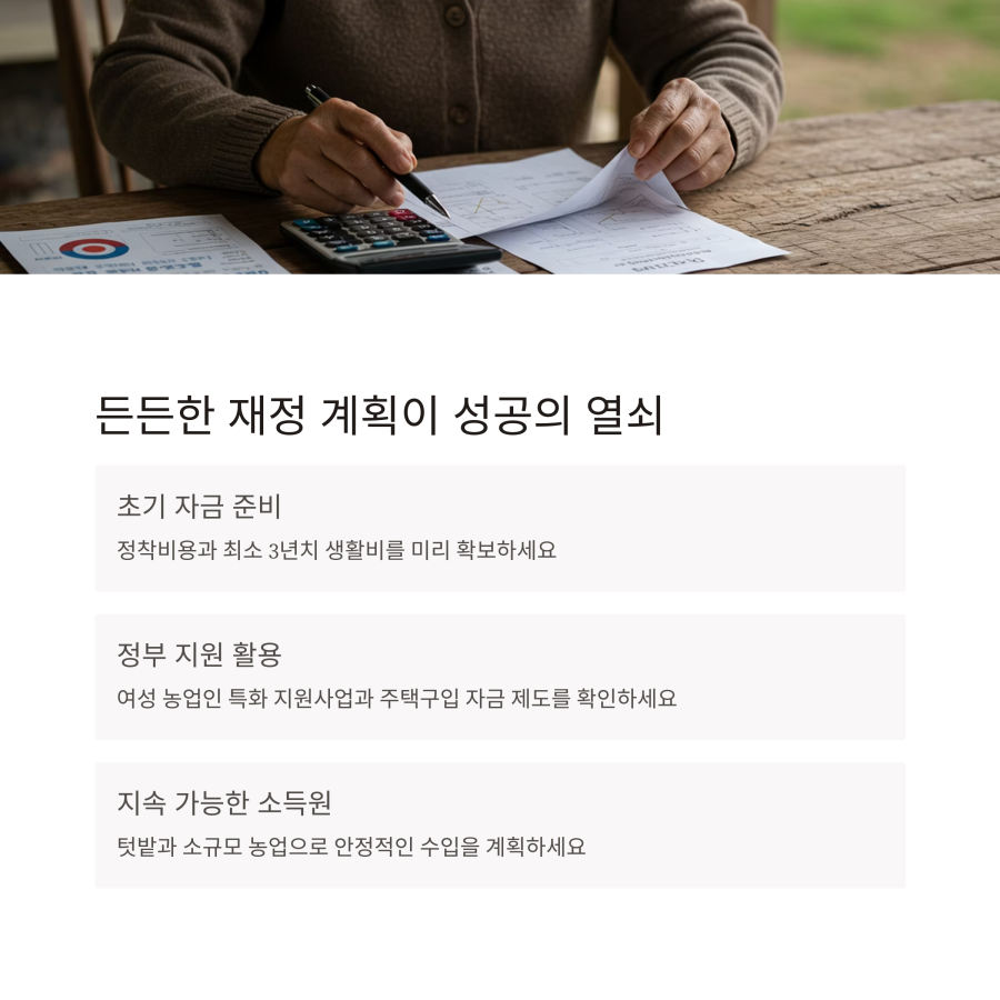 주택 마련 비용, 농지 구입 또는 임대 비용, 농기구 구입비, 초기 운영자금 등 예상되는 지출을 꼼꼼히 계산해보세요. 특히 수입이 안정될 때까지는 충분한 여유 자금이 필요합니다.