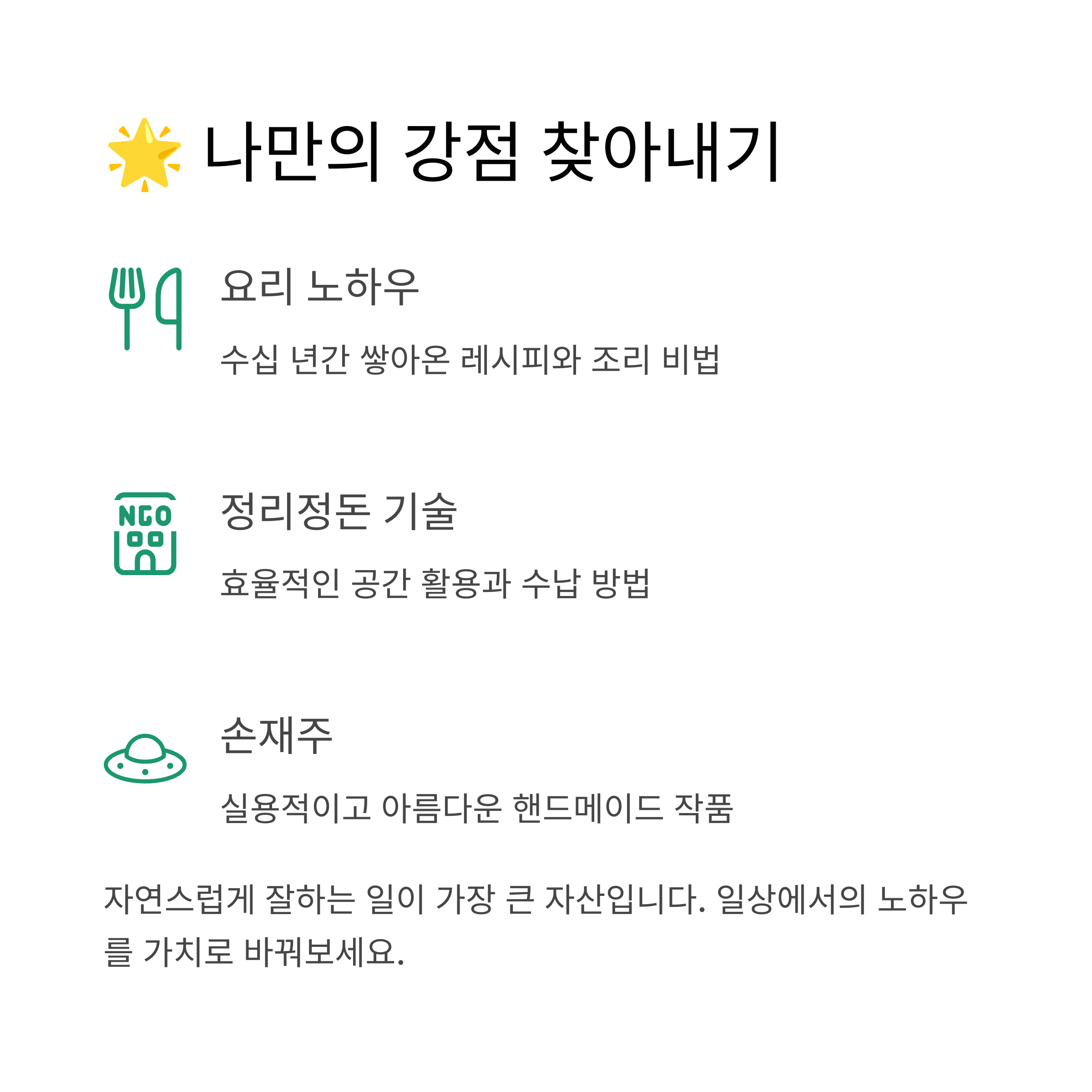 수익을 만들기 위한 첫 번째 단계는 자신만의 강점을 발견하는 것이에요. 50년 넘게 살아오면서 쌓은 경험과 노하우는 그 자체로 엄청난 자산이랍니다.