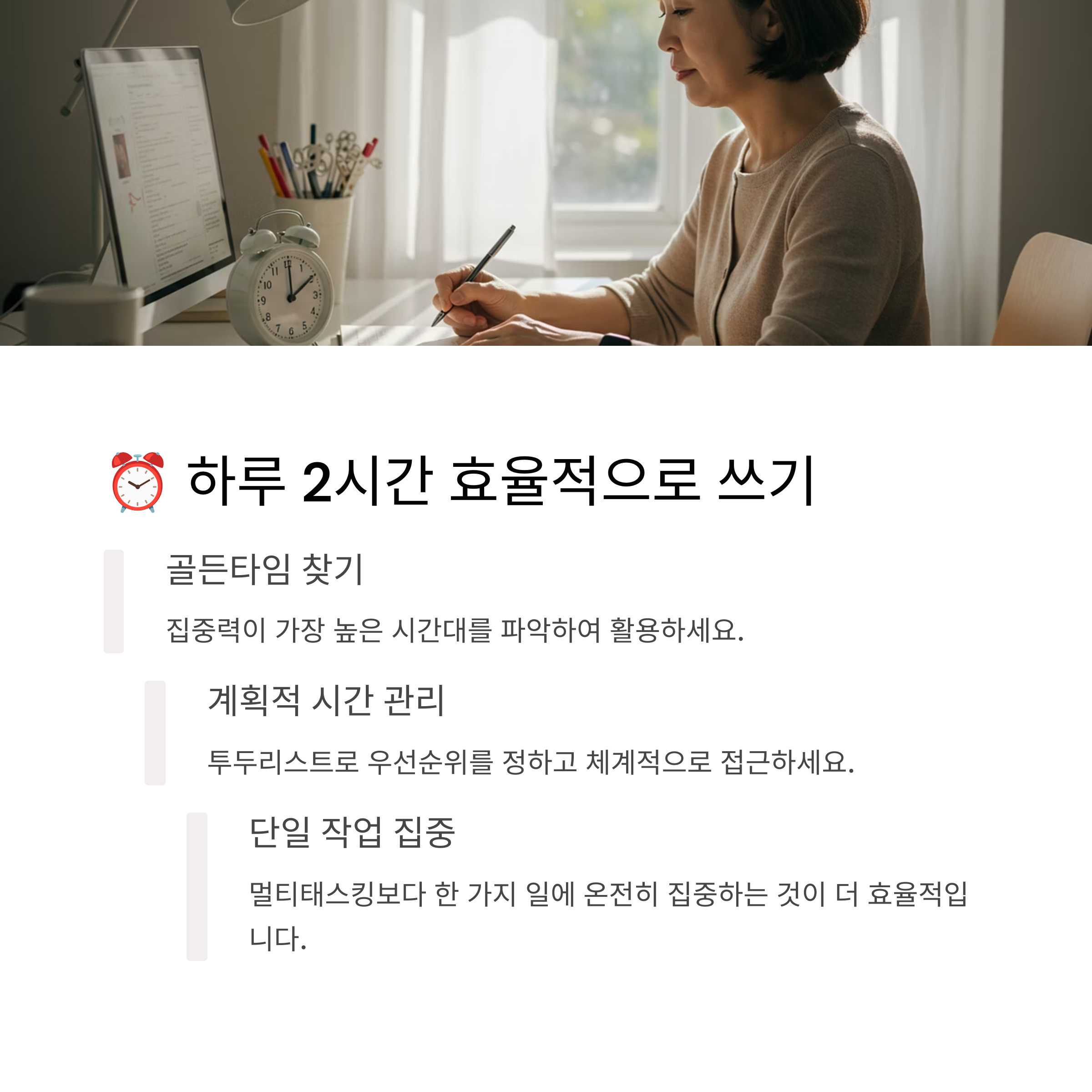 바쁜 일상 속에서 2시간을 꾸준히 확보하는 것도 쉬운 일은 아니에요. 하지만 계획적인 시간 관리를 통해 충분히 가능해요!