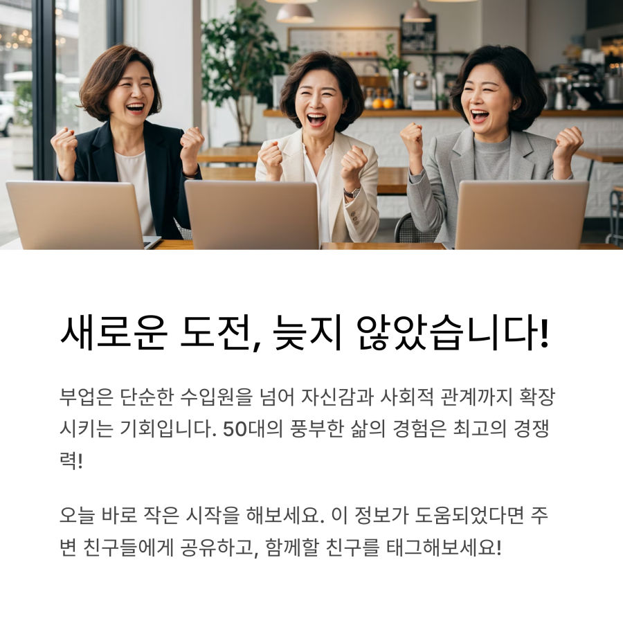 부업은 단순히 경제적인 이득만을 위한 것이 아니에요. 새로운 도전을 통해 자신감도 얻고, 사회와 연결되는 끈도 유지할 수 있답니다. 50대는 결코 늦은 나이가 아니에요. 오히려 새로운 시작을 하기에 딱 좋은 때랍니다!